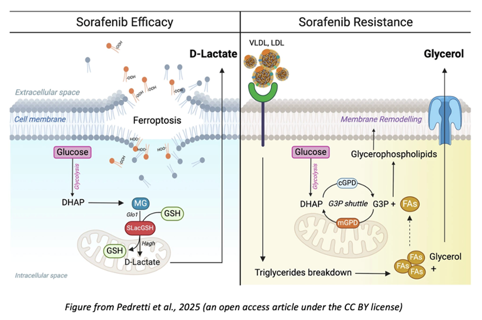 Interestingly, sorafenib-resistant cells failed to produce endogenous lipids required for the synthesis of lipid membranes, thus requiring exogenous lipids to survive. In particular, some specific lipids -such as triglycerides and free-fatty acids rather than cholesterol- contributed to increase cell resistance to sorafenib. Central to this process is the ability of sorafenib-resistant cells to divert glycolytic products toward glycerol rather than D-lactate, with glycerol serving as the backbone for membrane phospholipid synthesis.