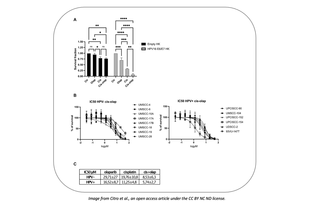In a recent paper by Citro et al., the authors headed by Susanna Chiocca -PI at the department of experimental oncology of IEO- exploited preclinical models of HPV+ and HPV- HNC to evaluate the killing efficacy of PARPi olaparib in combination with DNA damaging chemotherapy -by exacerbating the chemotherapy-induced unrepaired DNA damage-related stress-, and to unveil the underlying molecular mechanism.